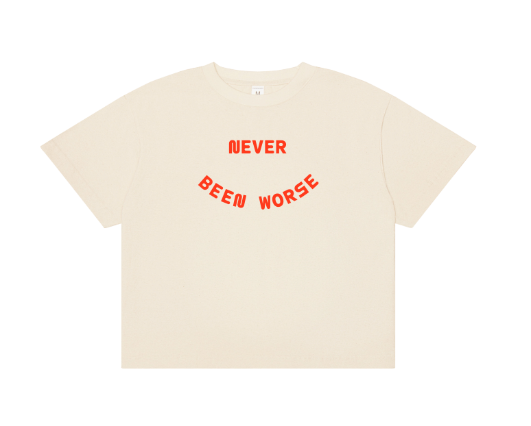 Ben Abraham 'Never Been Worse Tee' features a red Never Been Worse on printed on the front and a Never Been Better printed on the back of a Scour unisex cropped, boxy tee.